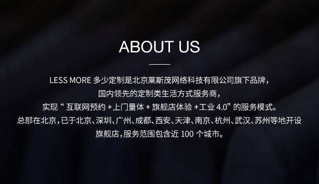 LESS MORE 多少定制是能夠提供男士全品類定制產品的生活方式品牌,對于中國商務男士來說,定制是對西裝最認真的態(tài)度。